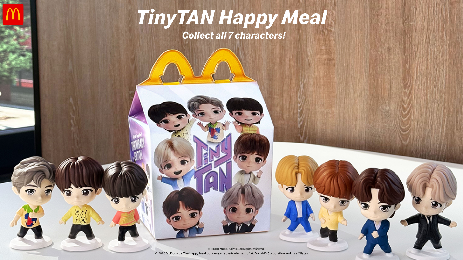 The TinyTAN Happy Meal features figurines of TinyTAN characters RM, Jin, Suga, j-hope, V, Jimin, and Jungkook; a cool graphic collectible card; and a TinyTAN Happy Meal digital K-Pop dance game—everything wrapped inside blind boxes, making each unboxing thrilling and filled with excitement.