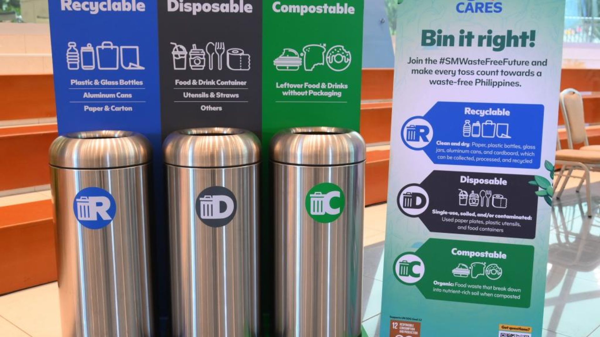 Bin it right! SM Cares promotes proper waste segregation with clearly marked bins for recyclables, disposables, and compostables—helping communities take part in building a waste-free.